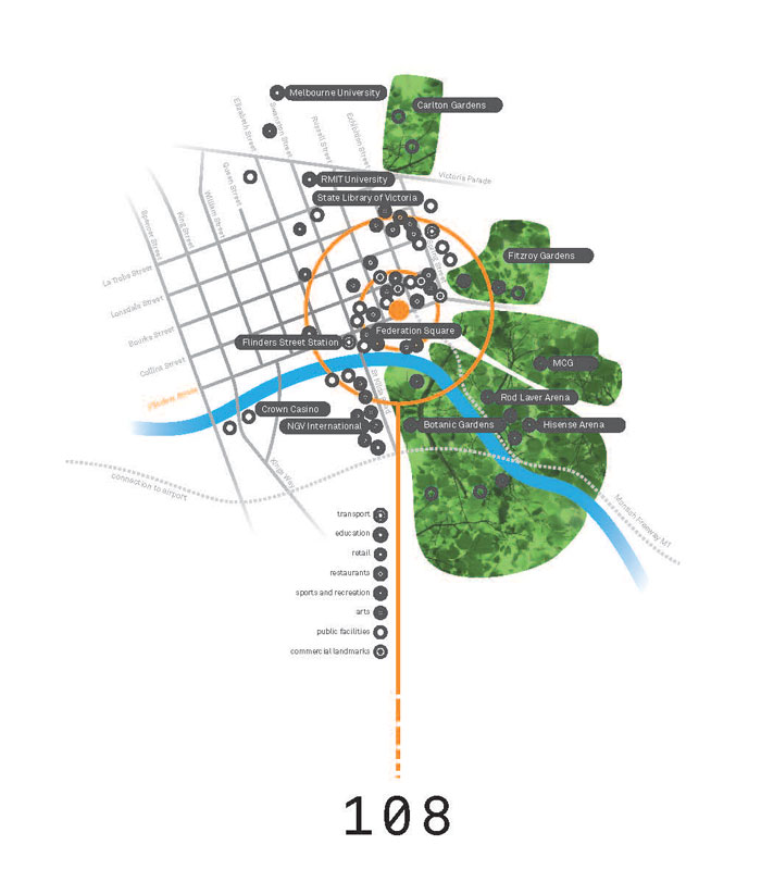 Docklands只有一个短车程的有轨电车,附近的Flinder街区火车站可以带您到达主要的郊区,右边有Echibition公路直通CityLink。无论您是否将这里称为东区、或是最北部建立,108 Flinders Street都是中心,墨尔本的心脏。