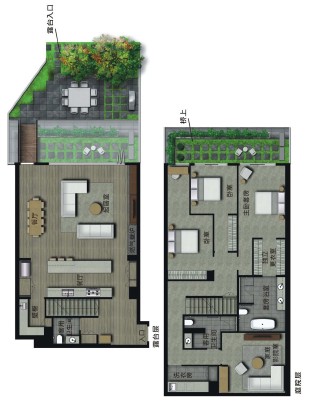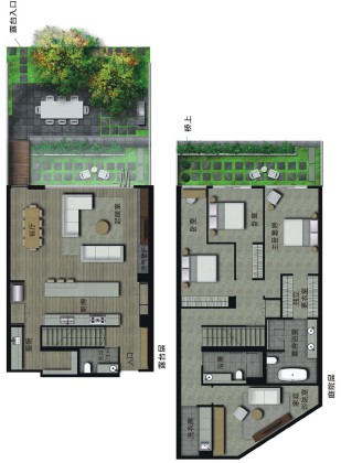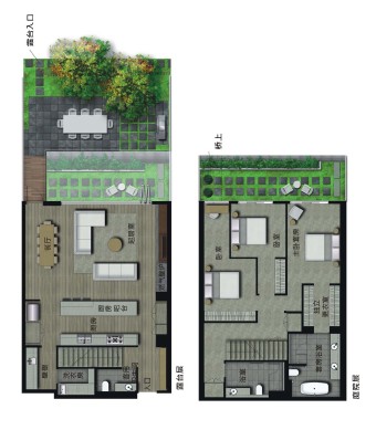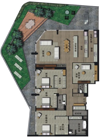 屋顶设施包括露天的烧烤架和壁炉,配有厨房设施的小餐厅。