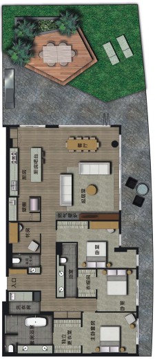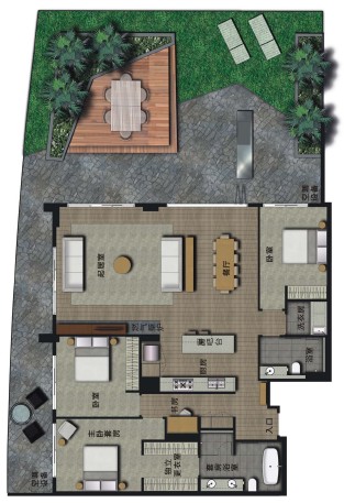 配备大屏幕影音欣赏室,日光浴躺椅以及配有休息长椅的小菜园。