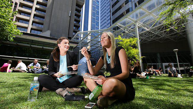 在珀斯市中心办公大楼之间的一个小公园里,26岁的路德格斯(Emma Rodgers)和老同学莫娜翰(Olivia Monaghan)正一起吃午餐。她们为珀斯市中心的两家石油和天然气公司工作。她们说,她们的老板和同事都很明白在午餐时间休息一下的好处。艾玛说,在一天的中间休息一下,换换环境,可以让头脑清醒。