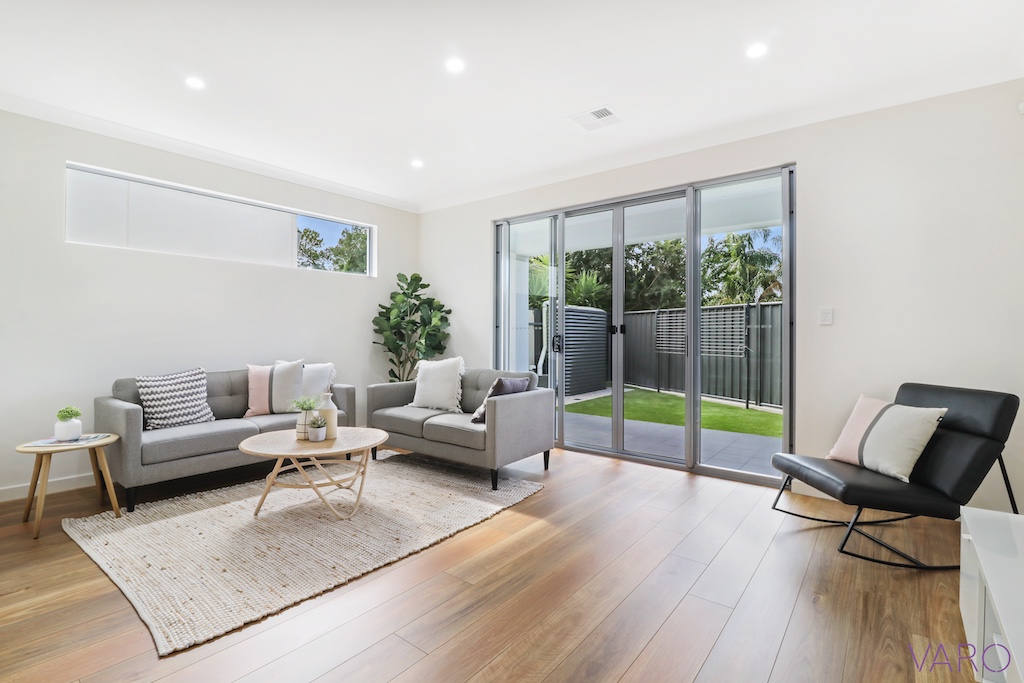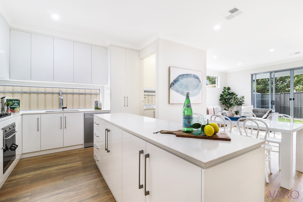 *在美丽的光线充足的开放式生活空间中享受快乐,舒适地融入时尚和时尚的厨房,延伸到瓷砖地板。