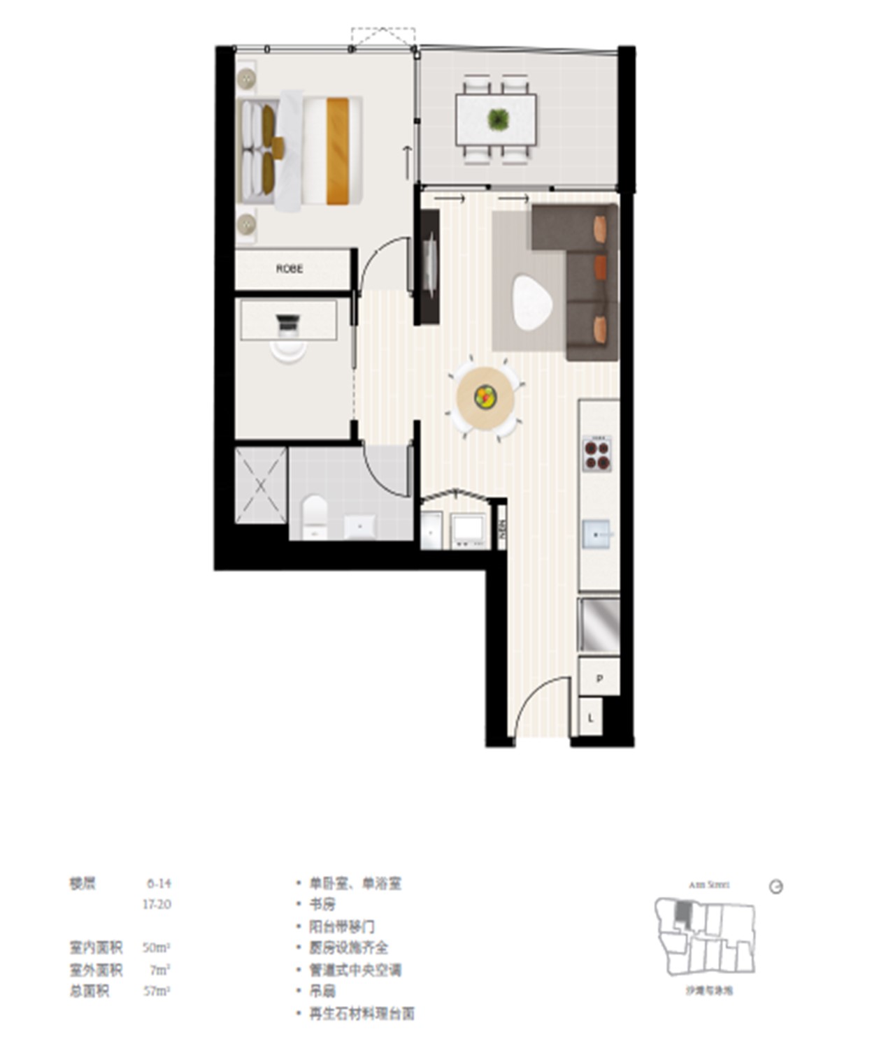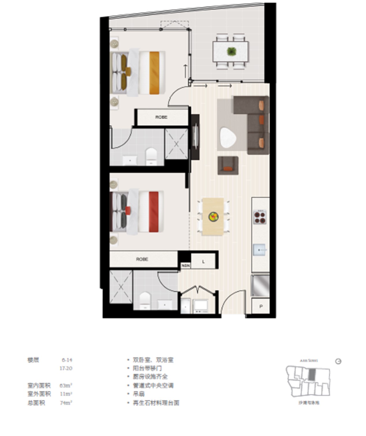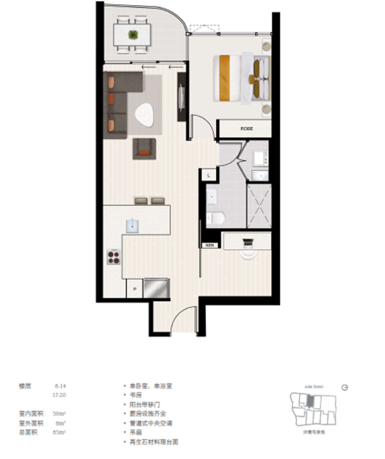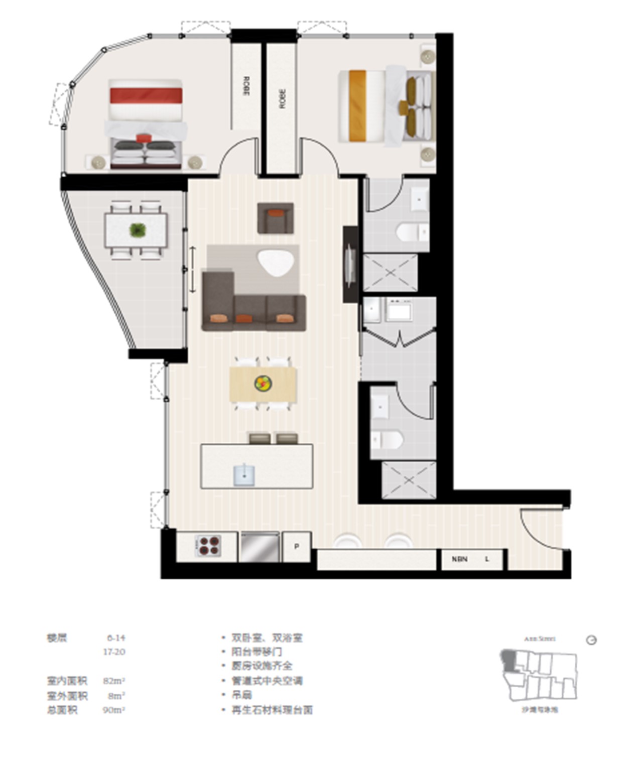 设计风格优雅时尚,色调中性,装饰豪华。拥有开放式生活空间,落地窗设计带来充足的自然采光,整座大楼共将推出 207 套单卧室和双卧室公寓,226个停车位。