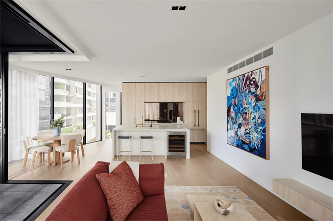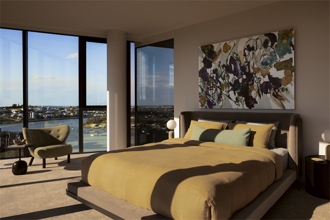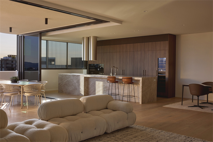 每套公寓的开放式起居室设计都旨在最大限度地利用空间、光线和视野。起居区正面和侧面均采用落地双层玻璃,住户可以享受广阔的视野和充足的自然光线。