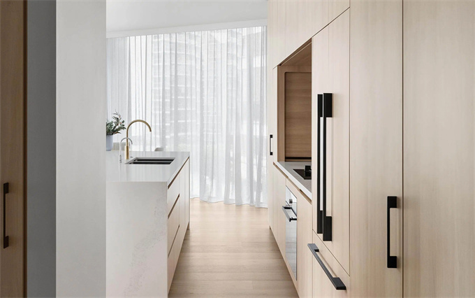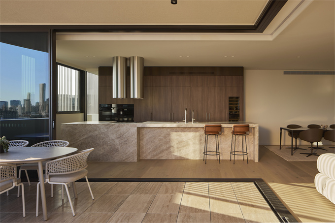 每间次顶层公寓都散发着低调奢华的气息,配有一个 5 米长的整体式岛台,由皮革石英岩泰姬陵石制成,并配有定制细木工墙。每一个细节都经过精心策划,体现了安静奢华的典范。