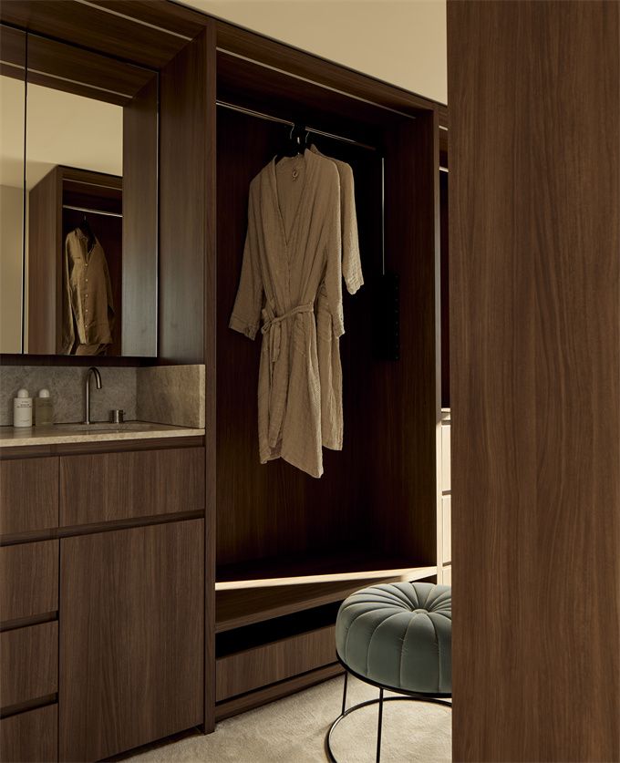 主人套房配有豪华的全高步入式衣柜和午夜厨房,设有带水槽的石质台面和台下迷你吧冰箱,可存放必需的维生素和护肤品。