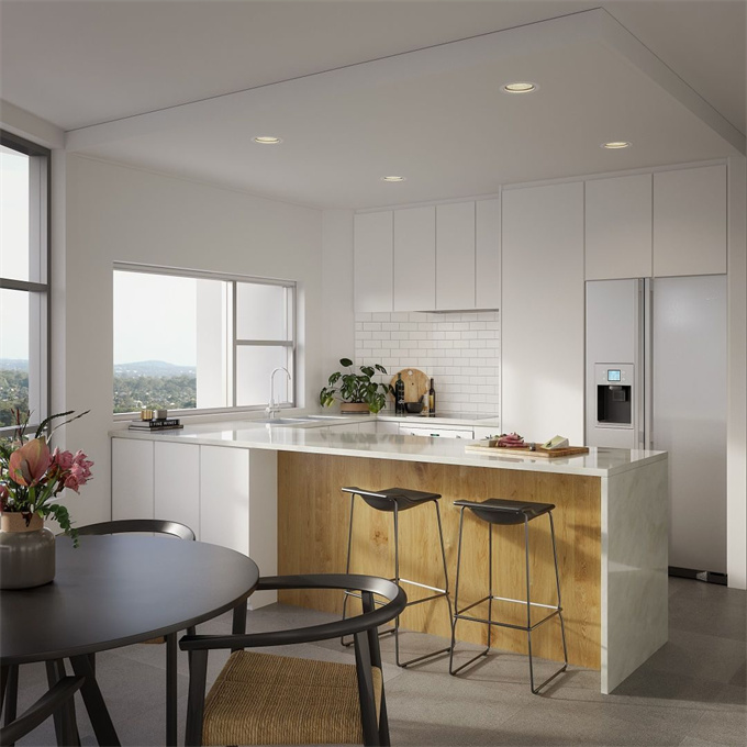 Curve Birtinya 提供两种不同的配色方案(暖色调和冷色调),住户可以根据自身喜好和生活方式选择最合适的装修风格。“暖色调”以柔和的浅褐色和暖棕色为主,而“冷色调”则以白色和灰色为主。两种配色方案均采用木纹风格的特色细木工,为空间增添传统韵味。