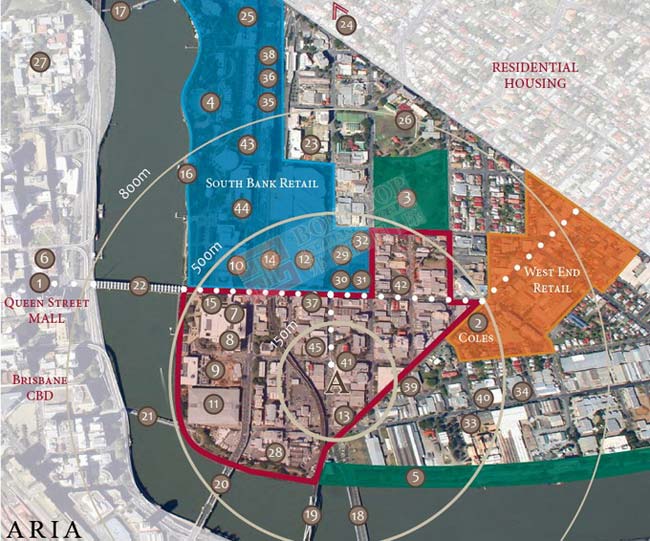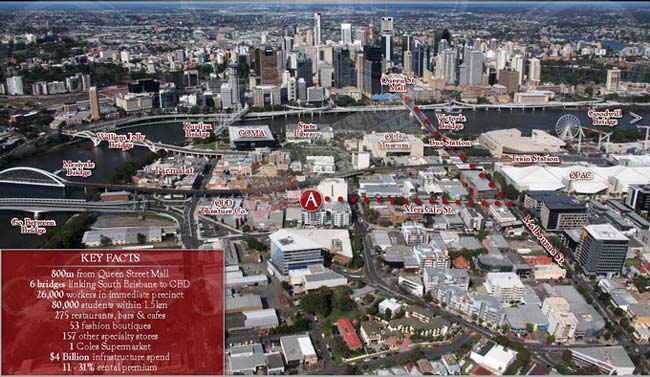 1. 投入$ 4,000,000,000打造基本生活设施; 2. 一公里范围内有8万名学生(皆是潜在租客); 3. 三公里范围内有12万名学生; 4. 区内有2.6万名白领; 5. 布里斯班商业区有20万名白领; 6. 275家餐馆、酒吧及咖啡店; 7. 53家时装店; 8. 157家专卖店; 9. 公交、渡轮及火车站点。交通状况: 公交、火车站点,交通方便