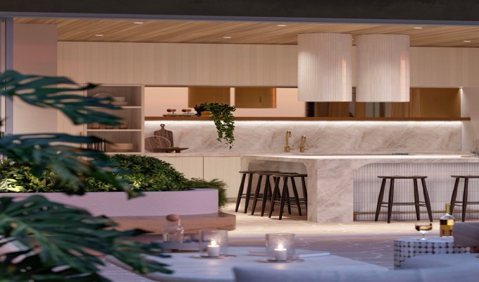 设计特点包括极简主义和现代风格,柔和弯曲的阳台和垂直刀片墙,以及瀑布式景观溢出底座边缘。