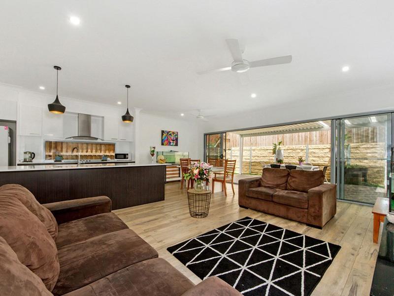 宽敞的、光线充足的开放式生活和用餐区,有滑动门,通往私人的户外用餐区和草地。