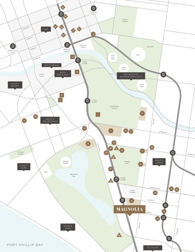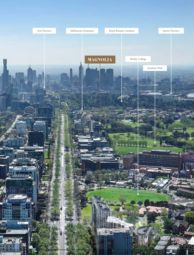 Magnolia位于墨尔本的林荫大道上,周围公园和花园环绕,拥有仅剩的迷人公寓,属于St Boulevard的独特公寓。 Magnolia位于High Street和St Kilda Road拐角处,距离中央商务区仅4公里,毗邻Albert Park、Fawkner Park、Royal Botanical Garden、Wesley College、Mac Robertson Girl’s High、Chapel Street购物区,还有通往四面八方的电车和公交线路。