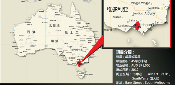项目特色介绍:卓越的地理位置,囊括了墨尔本最好的生活设施、离火车站只有150米。极短距离连接墨尔本市中心、临近墨尔本大学、皇家理工大学、维多利亚大学。 项目恰如其分的细节与造工,厨房以及浴室都配上最优雅的质料。特高的楼顶,屏幕式的玻璃窗户,全透视式的琉璃阳台。采光尽显优雅,出色的城市视野、四周的绿地公园,辽阔的Phillip海湾。