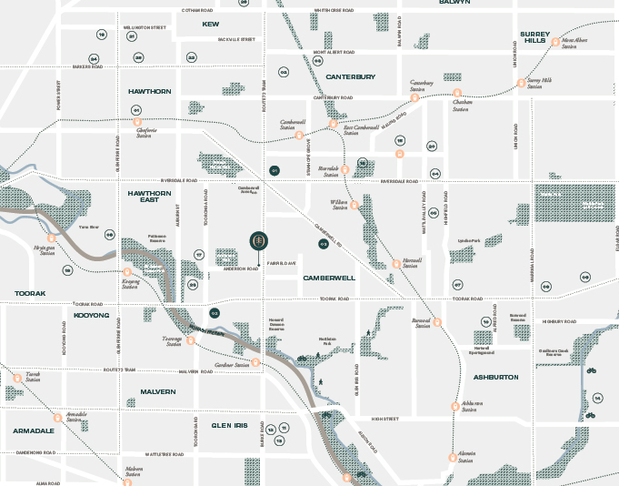 Camberwell及Hawthorn都是成熟的社区,设施齐全,交通便利。您可以走进艺术风格浓厚的Rivoli影院欣赏一部电影,或者在备受青睐的Sunday Market漫步,挑选复古的物品。该项目邻近爱德华时期风格的火车站,方便您前往市区,另外,本项目靠近Burke Road沿线的电车站。