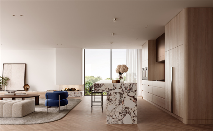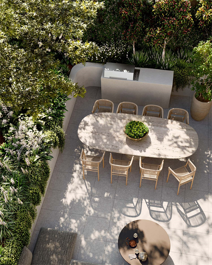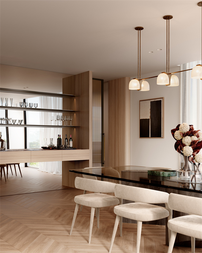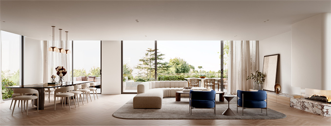 宽大的北侧落地窗引入大量自然光,增强了空间感,促进了室内和室外空间之间的无缝流动。这种无缝过渡在宽敞的厨房和用餐区中最为明显,它毫不费力地流入宽敞的双阳台,培养了一种最好的室内外生活文化。在这里,一个专门的户外用餐区域允许在星空下举行难忘的聚会,并由精心设计的餐具室提供支持,提供充足的存储解决方案。