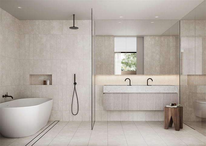 这个布局合理的空间配有醒目的天然石材表面和浅灰色哑光瓷砖,是形式和功能的颂歌。精心设计的玻璃窗,让沐浴在自然光中从未如此吸引人。定制的天花板淋浴和独立浴缸营造出仪式感,让您享受设计带来的宁静治愈力量。巧妙整合的双盆储物空间意味着无需牺牲另一半空间。