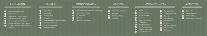 格伦艾里斯 (Glen Iris) 的魅力之一在于其拥有通往顶级学校的独家通道,例如格伦艾里斯小学 (Glen Iris Primary School)、圣心学校 (Sacre Coeur)、科罗瓦圣公会女子学院 (Korowa Anglican Girls College)、考菲尔德文法学校 (Caulfield Gramma)、苏格兰学院 (Scotch College)、坎伯韦尔女子文法学校 (Camberwell Girls Grammar) 和坎特伯雷小学 (Canterbury Primary School)。