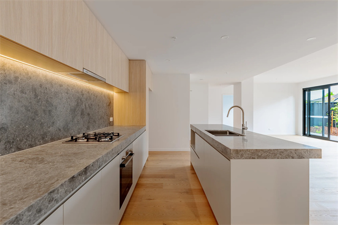 这款大理石兼具实用性和美观性——经久耐用、坚固耐用且孔隙率低,是潮湿区域的理想之选。Polytec 复合板和实木细木工制品增添了一丝温暖柔和的质感,与醒目的石材形成鲜明对比。