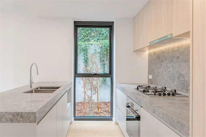 精致的欧式大理石厨房,提升您的烹饪体验。精美绝伦的苔原灰大理石由土耳其手工甄选进口,流畅地贯穿开放式起居区,无论是台面还是防溅板,都以奢华的80毫升尺寸展现其美感。
