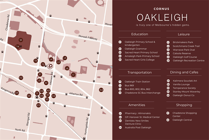 我们的 Cornus Oakleigh 公寓附近交通便利,距离 Oakleigh 火车站和 Chadstone 巴士换乘站仅 1.5 公里。此外,Cornus Oakleigh 距离 Princess 高速公路仅 200 米,距离 Monash 高速公路仅 2 公里。