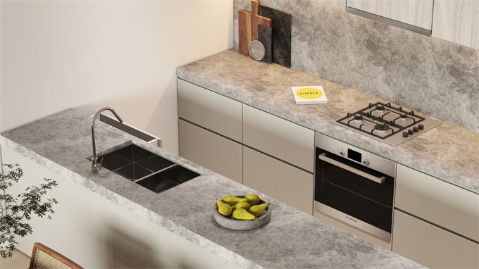 为了与引人注目的大理石相得益彰,选择了 Polytec 的精致牡蛎灰色定制层压板和木材细木工,在整个厨房和公寓中营造出无缝且有凝聚力的设计方案。凭借其卓越的工艺和周到的设计,厨房一定会成为您家的核心。