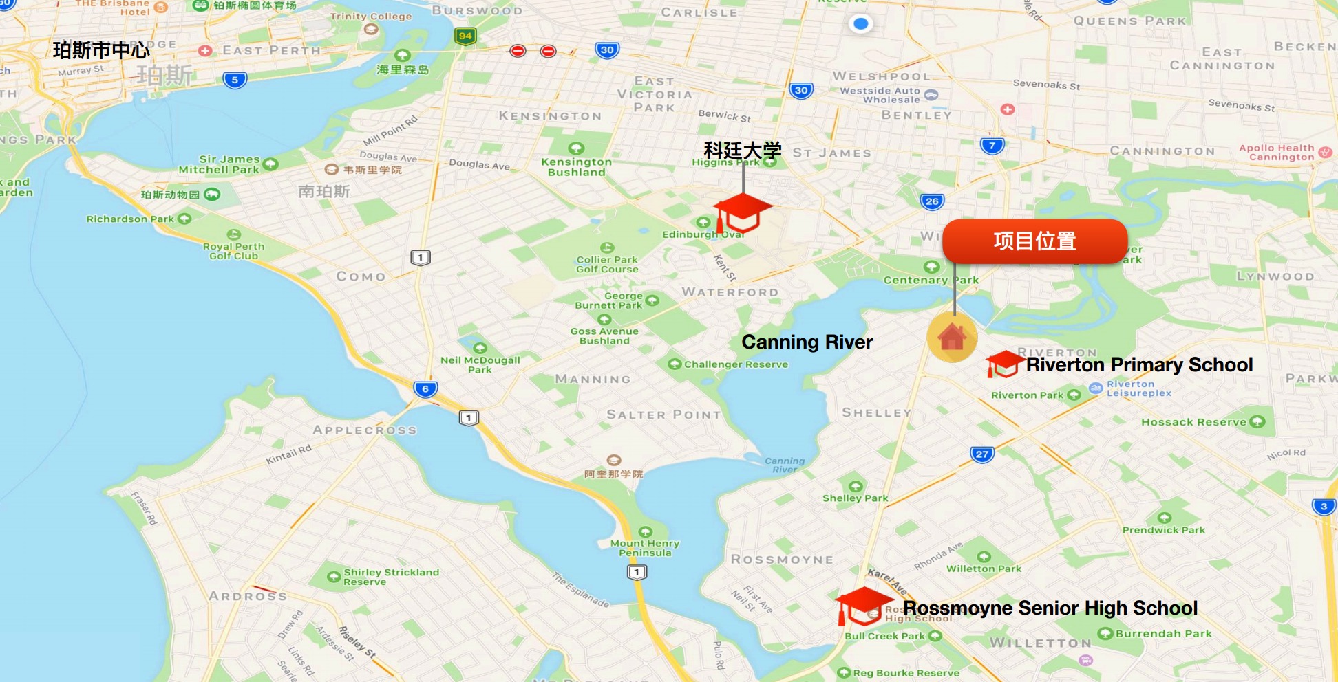 Riverton是珀斯当地最著名的公立学区之一,该区内有著名的Riverton Primary School 和Rossmoyne Senior High School,这两所学校优异的教学质量和学习环境培养出了 很多优秀的学生,很多望子成龙的家庭都趋之若鹜,整个区的居住环境和氛围都非常好。 区内还有一条美丽的坎宁河(Canning River),沿河景色别具一格。