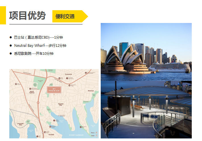 No.1 Premier位于悉尼北区第一富人区Neutral Bay,与悉尼市中心仅一桥之隔,驱车仅需6分钟。低密度别墅型公寓,非凡品味,高品质室内布局,人性化居家体验;无垠视野,无遮挡高档明亮大窗,全方位欣赏悉尼全景。步行数分钟即可达到超市Coles;门口即有公车站直达市中心,交通极方便。No.1 Premier是悉尼富人区最好的学区房之一,除了Neutral Bay Public School外,还有悉尼排名前列的Mosman High School以及悉尼最著名的富人私校Wenona School。非常适合自住或投资,机会难得。