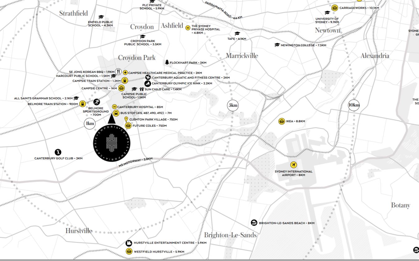 Campsie属于悉尼较早通火车的区域之一,位于T3 Bankstown线路上,从这条火车线上,Campsie可以在20分钟内直达悉尼中央火车站即澳洲最大公共交通枢纽,并连接悉尼CBD内环线。项目距离: