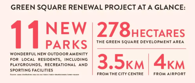 Green Square是悉尼市中心政府在100多年来第一次建造一个新的Town Centre。该区凝聚着全球顶尖城市规划专家的智慧,已成为悉尼最具国际化风格的活力城区之一。Green Square将被定位成集住宅,商业和文化为一体的综合性社区,与周边葱郁的公园绿地景色融为一体,各种精彩多元的生活设施尽在咫尺,在这里您可以尽情享受最精彩的悉尼生活。