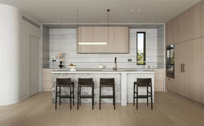 在私人住宅区,宏伟的主人套房拥有房屋大小的比例,柔和的漫射光线透过弧形窗户过滤。内饰采用美丽的大理石、橡木和深青铜装饰,反映了海港海岸的自然美景,营造出平静和平衡的氛围。