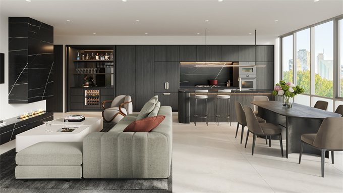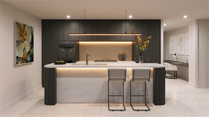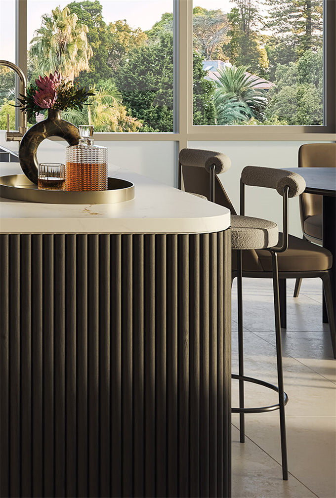 厨房柔和弯曲的早餐岛为空间带来视觉上的柔和感,采用橡木或黑色鸡翅木色调的定制细木工,搭配优雅的大理石风格工程石台面。