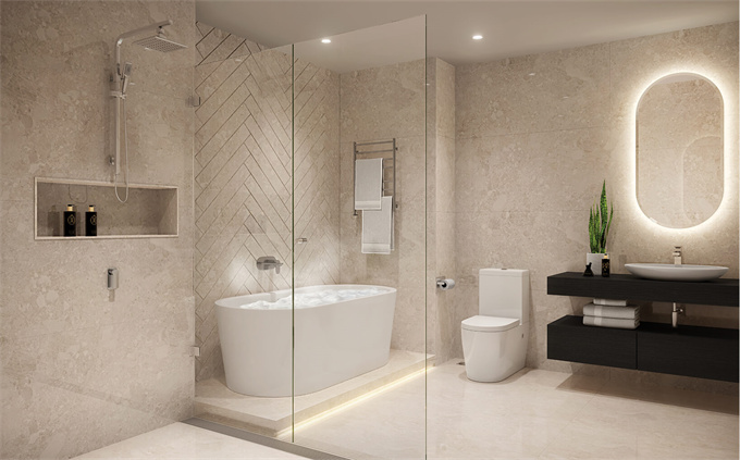 瓷砖浴室采用经典中性色调、优雅装饰和整洁空间,无框玻璃淋浴屏、壁挂式木纹盥洗台和嵌入式淋浴储物角,保持简洁干净的外观。通过引入背光镜子和独立浴缸的弧形造型,美感变得柔和而平静。加热毛巾架确保全年舒适。