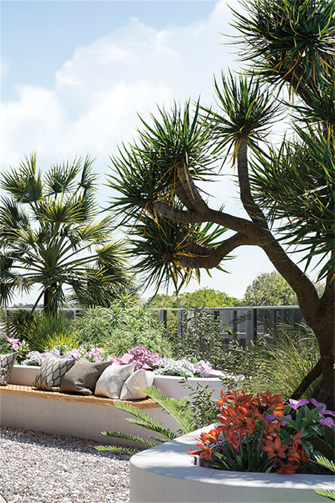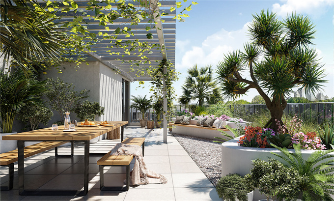 One Rose 的景观公共空间借鉴了该地区豪宅的华丽花园,营造出一种放松和静谧的感觉。两座建筑之间有一个中央花园,保留了一棵宏伟的桉树作为其阴凉的中心。