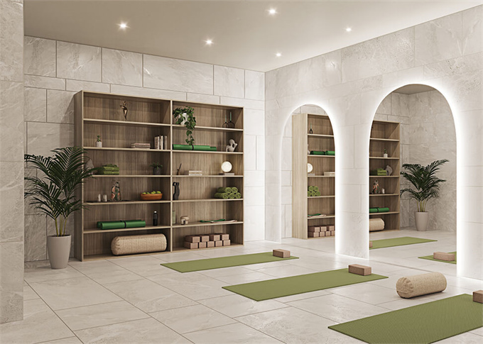 享受定制设计的豪华健身室,您可以在这里进行晨间冥想、练习瑜伽或舒展身心。带有 LED 背光的拱形镜子让整个空间沐浴在柔和的光线中,还配有瑜伽垫、泡沫滚轴和轻便健身器材供您锻炼。