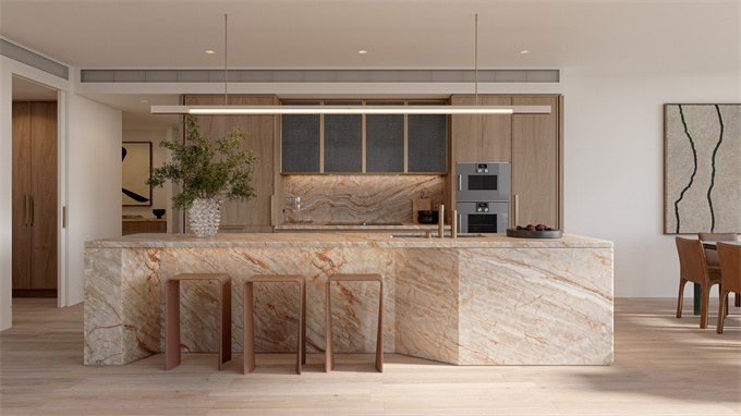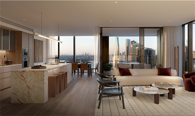 住宅以自然美景为特色,展现出低调优雅的精致,有机与华丽、宏伟与优雅融为一体。私人阳台扩大了居住空间,让您可以完全沉浸式地体验悉尼的绝妙气候,并可以坐在前排欣赏白天和夜晚的城市和海港的风景。天然石材在雕塑设计的厨房中占据中心位置,与建筑的建筑风格相呼应,从代表悉尼港自然景观的砂岩悬崖中汲取灵感。