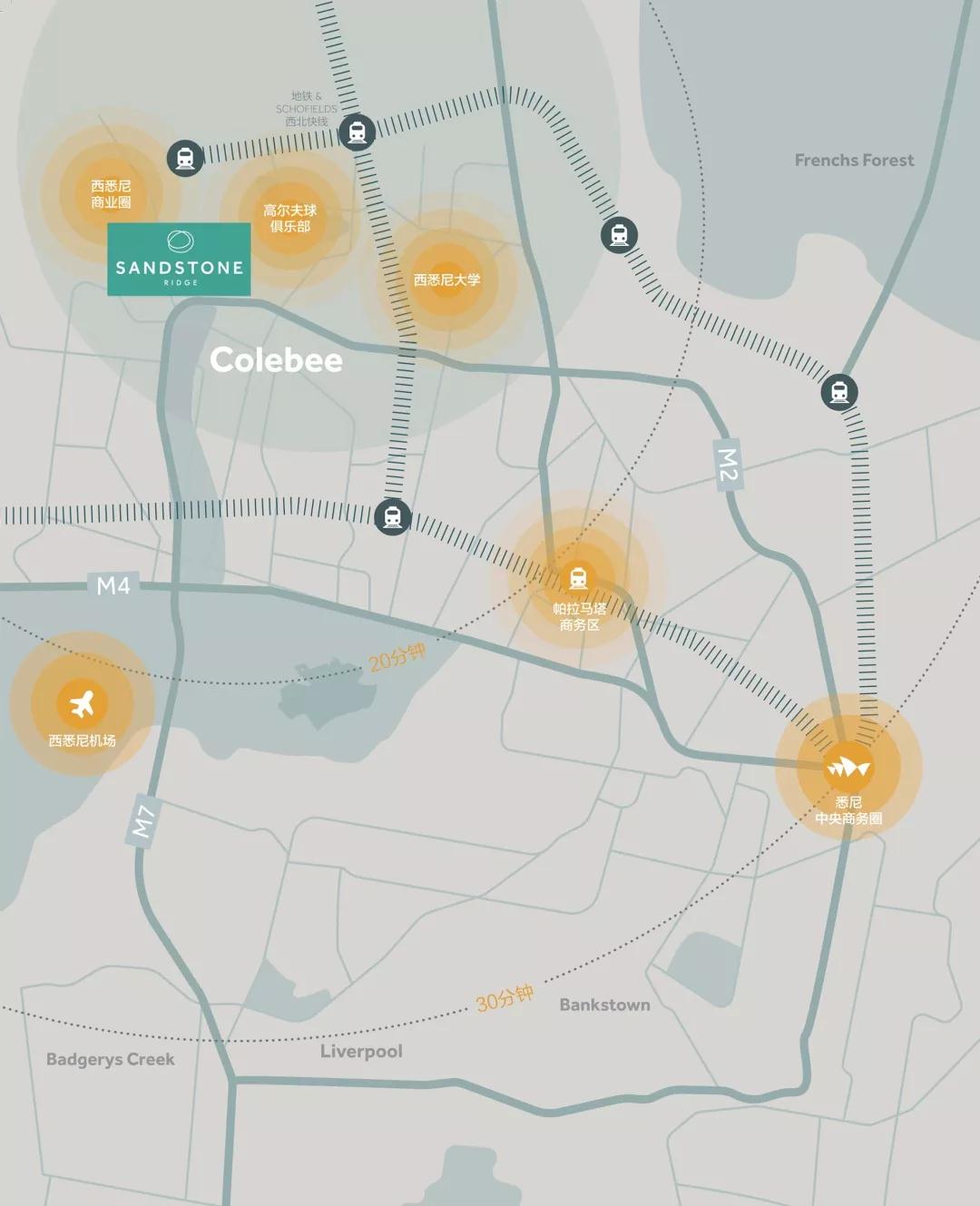 Sandstone Ridge别墅社区坐落于悉尼西北新兴经济开发区Colebee,距离Parramatta CBD 17公里,距离Sdyney CBD 40公里,处于西北部经济及就业增长带的中心区域,被Blacktown、Rouse Hill及Marsden Park环绕,交通四通八达,由M7/M2高速干道与市中心相连,最大化地受益于西北整体经济及人口增长。
