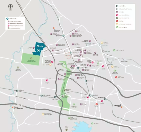 项目坐落于Richmond Road,临近M7和M4,方便居民出行及到达悉尼CBD。开车仅10分钟即可到达Schofields火车站,从Schofields火车站乘车不到一小时就可以抵达Central。从项目还可以眺望蓝山的自然风景,并且周围有约20公顷的开放区域供居民使用。
