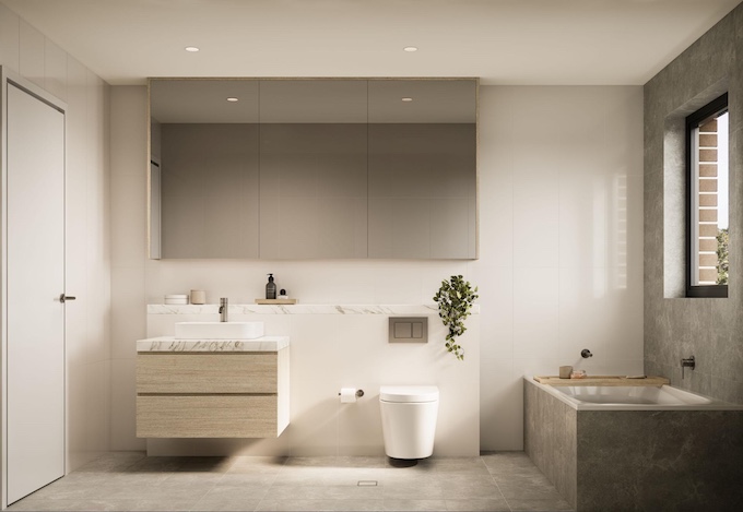 卫浴空间则以优雅与宁静为设计核心,采用柔和的 灰白色系装饰,营造出舒适而放松的氛围。精心设计的布局与高品质装饰材料,使每一个浴室都如同私人放松空间,让住户在繁忙的一天后能够在这里得到真正的休息与舒缓。