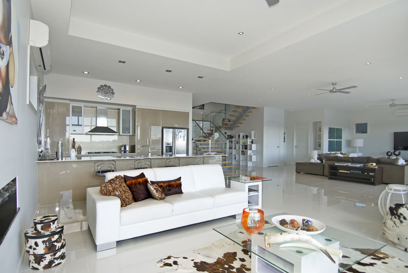广阔的生活区和开放的大露天池环绕的是一个设计师的梦想厨房,壁炉。