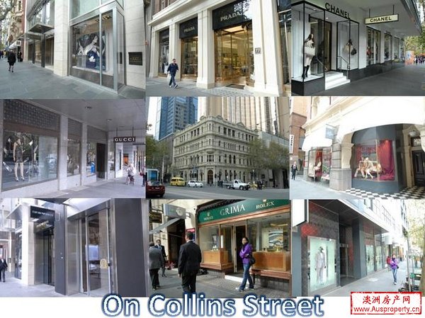 Collins Street位于核心CBD区内,是墨尔本的金融及商务中心。澳大利亚各大银行的总行、澳大利亚股票交易所、很多保险公司等金融投资公司的办事处都在这条街上。