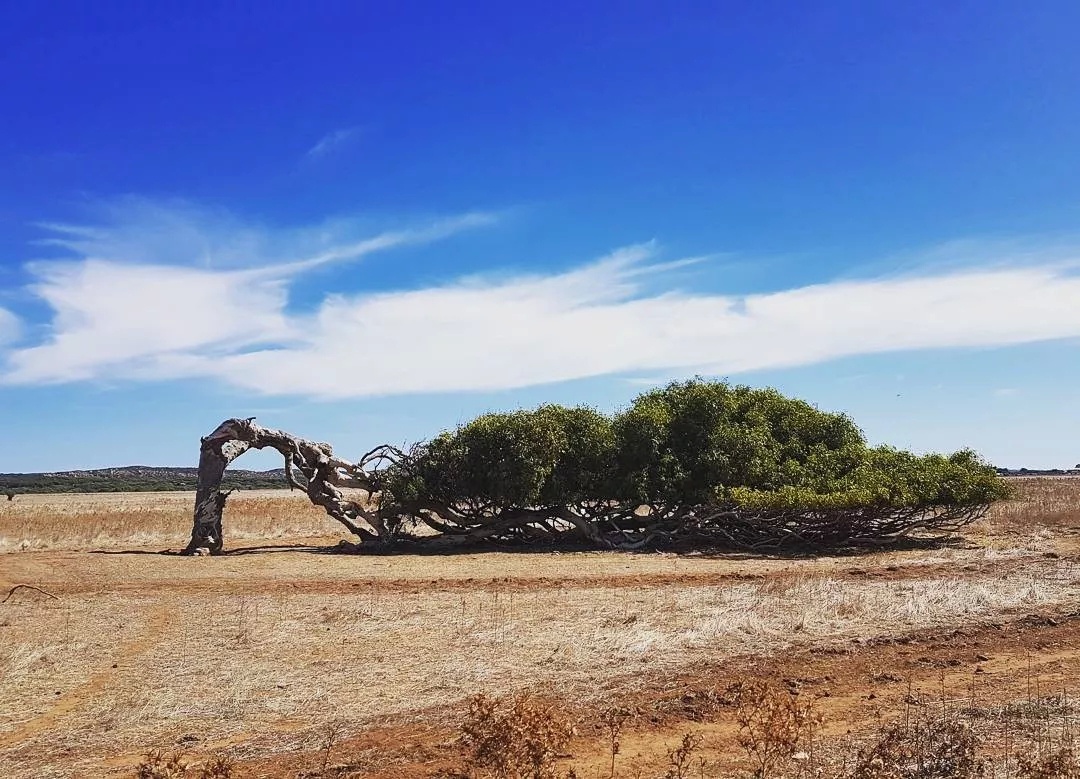 从珀斯一路往北,你还会经过这颗神奇的树。90度弯折的根茎直接躺倒在地上,而出现这种现象则是因为西澳强劲的南风,但这么多年了,这棵树依然顽强地生长着,让人不得不佩服生命的顽强。