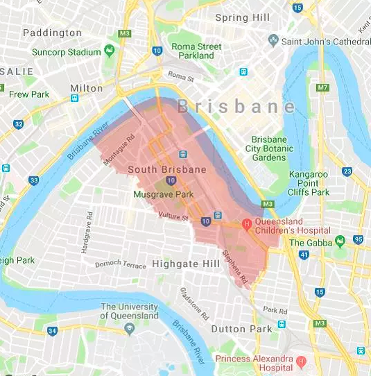 South Brisbane西侧毗邻West End和Highgate Hill区,东边是布里斯班河,发达的交通网成为了很多大学生和在附近工作的年轻人选择居住在这里的重要原因。