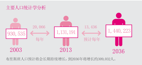 昆士兰州经济和统计研究办公室(The QueenslandOffice of Economic and Statistical Research)预计,到2036年布里斯班地方政府地区(Brisbane Local Government Area,简称LGA)内的居民人数将由2013年的113万增长至大约144万人。