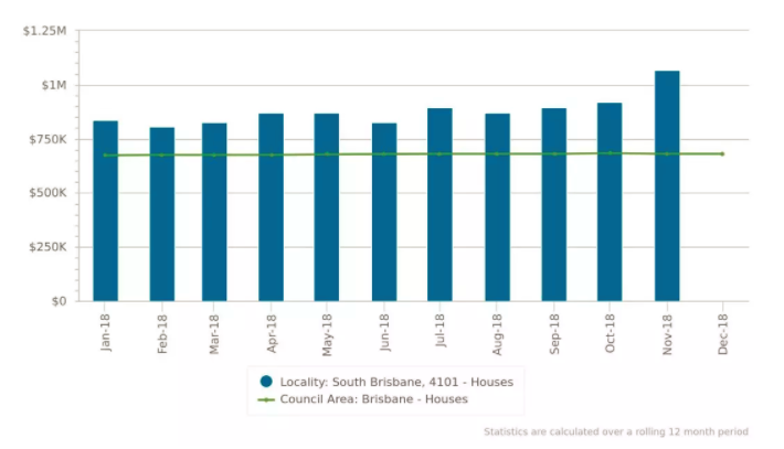 蓝色柱状图:South Brisbane区独栋房屋的中位售价