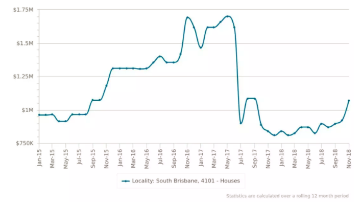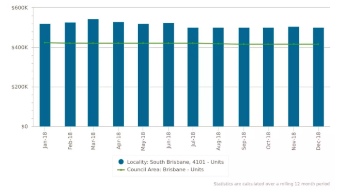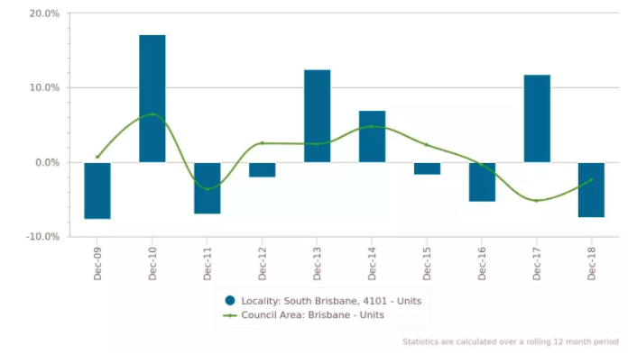 South Brisbane区的公寓的价格一直显著高于城市平均水平;变化趋势整体和布里斯班市一致,但变幅远远超过城市平均水平,尤其是涨幅上。