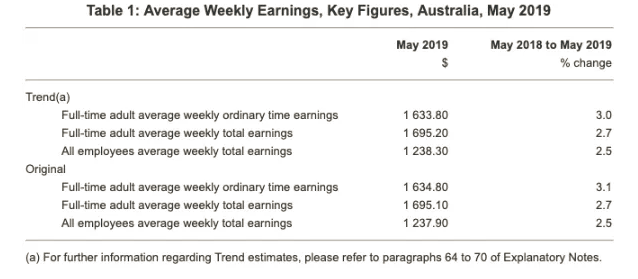 在截至2019年5月的12个月里,全职工作的成人平均每周的ordinary time收入增长了3.0%,达到1633.80澳元。