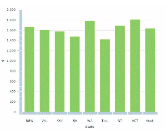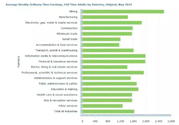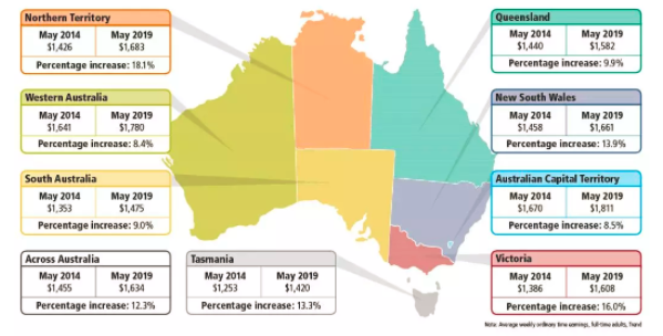 在过去五年中,ACT和西澳大利亚州的全职平均收入最高(1,811澳元),最低的是塔斯马尼亚州(1,420澳元)和南澳大利亚州(1,475澳元)。