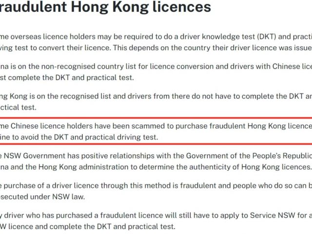 新州政府特意点名,表示在此之前有些中国驾照持有者被骗,在网上购买了伪造的香港驾照,就为了逃避知识测试以及实践考试。其表示通过这种方法购买驾照属于违法行为,一旦被发现将依据维州法律进行起诉。