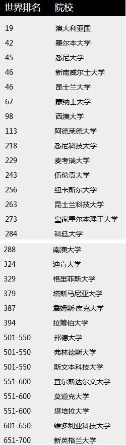 澳洲八大仍旧保持着世界百强的实力, 澳大利亚国立大学表现突出, 上升 6 位, 排名19名;墨尔本大学排名42名;悉尼大学排名45名;新南威尔士大学上升2位,排名46;蒙纳士大学上升3位,排名67。