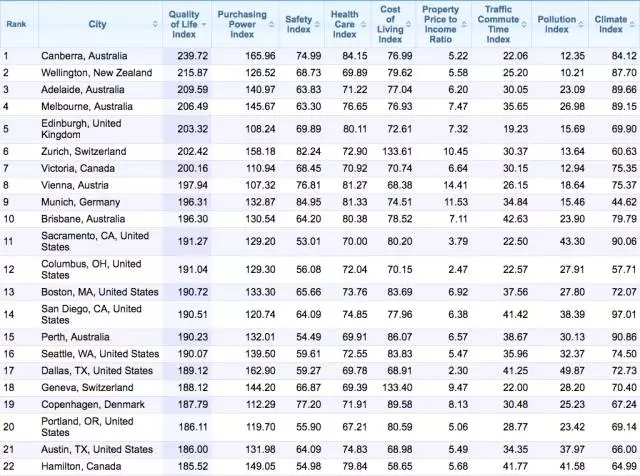 Numbeo是世界上最大的、用户投稿的城市和国家数据资源网站!而今年的排名也是由Numbeo提供调查结果。这份排名的考核指标非常完整,主要考核的是每个城市和生活质量相关的决定因素,比如各个城市的购买力、环境污染程度、房价和收入的比例、生活消费程度、医疗保健、交通和气候等。