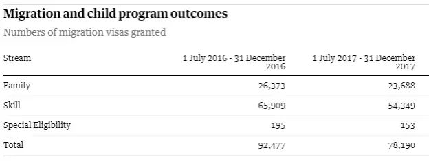在信息自由法之下获得的数据显示,2017-18财年前6个月发放的永久签证数量下降了15%,从9.2477万份降至7.819万份。