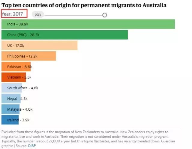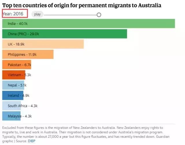 过去二十年来,澳大利亚永居移民的主要来源国已经发生了变化,之前大多移民是来自英国、南非等地,现在已经变成中国及印度。主要来看下2016和2017年的数据统计: